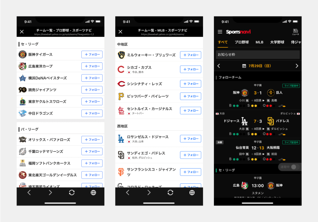 これまでお気に入りチームはプロ野球の1チームのみの登録でしたが、フォローでは複数チームの登録が可能です。対象はプロ野球だけでなく、MLB、高校野球、大学野球のチームまで広がり、試合一覧での優先表示、通知設定ができるようになります。