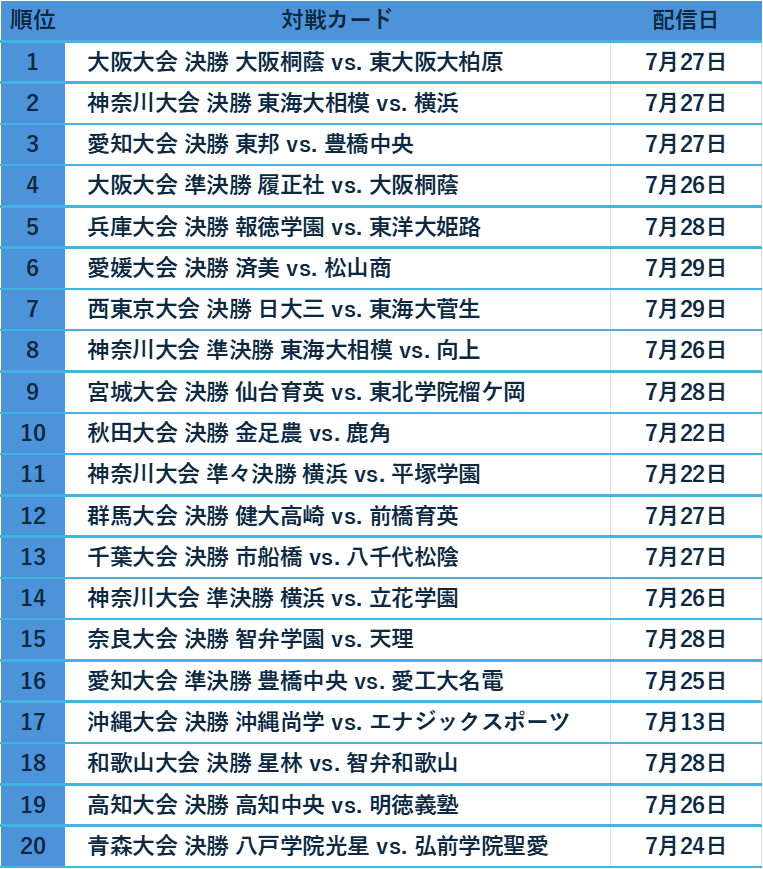 多くの視聴者が見守った地方大会の中で、バーチャル高校野球での視聴数が多かった上位20 試合を下記の通りご紹介します。